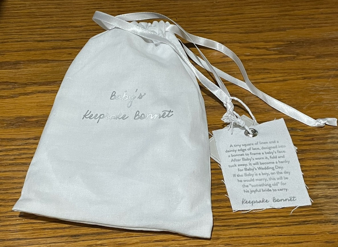 A tiny square of linen and a dainty edge of lace designed into a bonnet to frame a baby's face. After Baby's worn it, fold and tuck away. It will become a hanky for Baby's Wedding Day. If the Baby is a boy, on the day he would marry, this will be the "something old" for his joyful bride to carry.