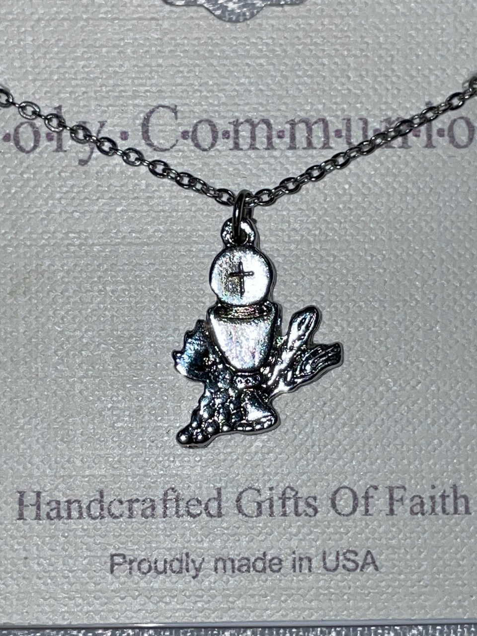 {"id":7379247038531,"title":"COMMUNION CHALICE\/GRAPES NECK","handle":"communion-chalice-grapes-neck","description":"3\/4 x 5\/8 inch polished finish First Communion silver plated chalice and Eucharist necklace on an 18 inch stainless steel rhodium plated chain. The necklace pendant is shaped like a chalice, which has the Eucharist above it. Surrounding the chalice are the other two traditional symbols of the rite of First Communion: grapes and wheat stalks. The back of the pendant is blank.","published_at":"2025-02-27T16:40:24","created_at":"2025-02-27T16:40:24","vendor":"SINGER AND SONS, FREDERICK","type":"COMMUNION","tags":["COMMUNION","Communion and Confirmation","Type_Communion Jewelry"],"price":1799,"price_min":1799,"price_max":1799,"price_varies":false,"compare_at_price":null,"compare_at_price_min":0,"compare_at_price_max":0,"compare_at_price_varies":true,"all_variant_ids":[42132450181187],"variants":[{"id":42132450181187,"product_id":7379247038531,"product_handle":"communion-chalice-grapes-neck","title":"Default Title","option1":"Default Title","option2":null,"option3":null,"sku":"990-0213","requires_shipping":true,"taxable":true,"featured_image":null,"image_id":null,"available":true,"name":"COMMUNION CHALICE\/GRAPES NECK - Default Title","options":["Default Title"],"price":1799,"weight":20,"compare_at_price":null,"inventory_quantity":3,"inventory_management":"shopify","inventory_policy":"deny","inventory_in_cart":0,"inventory_remaining":3,"incoming":false,"next_incoming_date":null,"taxable":true,"barcode":null}],"available":true,"images":["\/\/marytown-press-gift-store.myshopify.com\/cdn\/shop\/files\/990-02131.jpg?v=1740776267","\/\/marytown-press-gift-store.myshopify.com\/cdn\/shop\/files\/990-02132.jpg?v=1740776267"],"featured_image":"\/\/marytown-press-gift-store.myshopify.com\/cdn\/shop\/files\/990-02131.jpg?v=1740776267","options":["Title"],"url":"\/products\/communion-chalice-grapes-neck"}