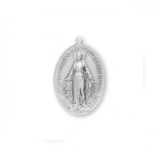 {"id":6732493226051,"title":"SS LARGE OVAL MIRACULOUS 27\"","handle":"ss-large-oval-miraculous-28","description":"Sterling Silver Large Oval(36mm) Miraculous Medal Necklace.\u003cbr\u003eBlessed Mother Mary with rays coming out of her extended hands, crushing a serpent under her feet.\u003cbr\u003eOval shaped double sided pendant.\u003cbr\u003eSolid .925 sterling silver.\u003cbr\u003eMedal is die struck.\u003cbr\u003eHand polished and engraved by New England Silversmiths.\u003cbr\u003eDimensions: 1.4\" x 0.7\" (36mm x 19mm)\u003cbr\u003eWeight of medal: 9.6 Grams.\u003cbr\u003e27\" Genuine rhodium plated endless curb chain.\u003cbr\u003eMade in USA.\u003cbr\u003eDeluxe velvet gift box.","published_at":"2022-09-12T12:07:38","created_at":"2022-09-12T12:07:38","vendor":"HMH\/Regina Manufacturing","type":"MEDALS","tags":["Chain Size_27\"","Material_Sterling Silver","Type_Miraculous Medal"],"price":11600,"price_min":11600,"price_max":11600,"price_varies":false,"compare_at_price":null,"compare_at_price_min":0,"compare_at_price_max":0,"compare_at_price_varies":true,"all_variant_ids":[40186953891907],"variants":[{"id":40186953891907,"product_id":6732493226051,"product_handle":"ss-large-oval-miraculous-28","title":"Default Title","option1":"Default Title","option2":null,"option3":null,"sku":"931-0151","requires_shipping":true,"taxable":true,"featured_image":null,"image_id":null,"available":true,"name":"SS LARGE OVAL MIRACULOUS 27\" - Default Title","options":["Default Title"],"price":11600,"weight":60,"compare_at_price":null,"inventory_quantity":2,"inventory_management":"shopify","inventory_policy":"deny","inventory_in_cart":0,"inventory_remaining":2,"incoming":false,"next_incoming_date":null,"taxable":true,"barcode":null}],"available":true,"images":["\/\/marytown-press-gift-store.myshopify.com\/cdn\/shop\/files\/S3106X.jpg?v=1746561561","\/\/marytown-press-gift-store.myshopify.com\/cdn\/shop\/files\/S310627_1.jpg?v=1746561561","\/\/marytown-press-gift-store.myshopify.com\/cdn\/shop\/files\/S3106.jpg?v=1746561465"],"featured_image":"\/\/marytown-press-gift-store.myshopify.com\/cdn\/shop\/files\/S3106X.jpg?v=1746561561","options":["Title"],"url":"\/products\/ss-large-oval-miraculous-28"}